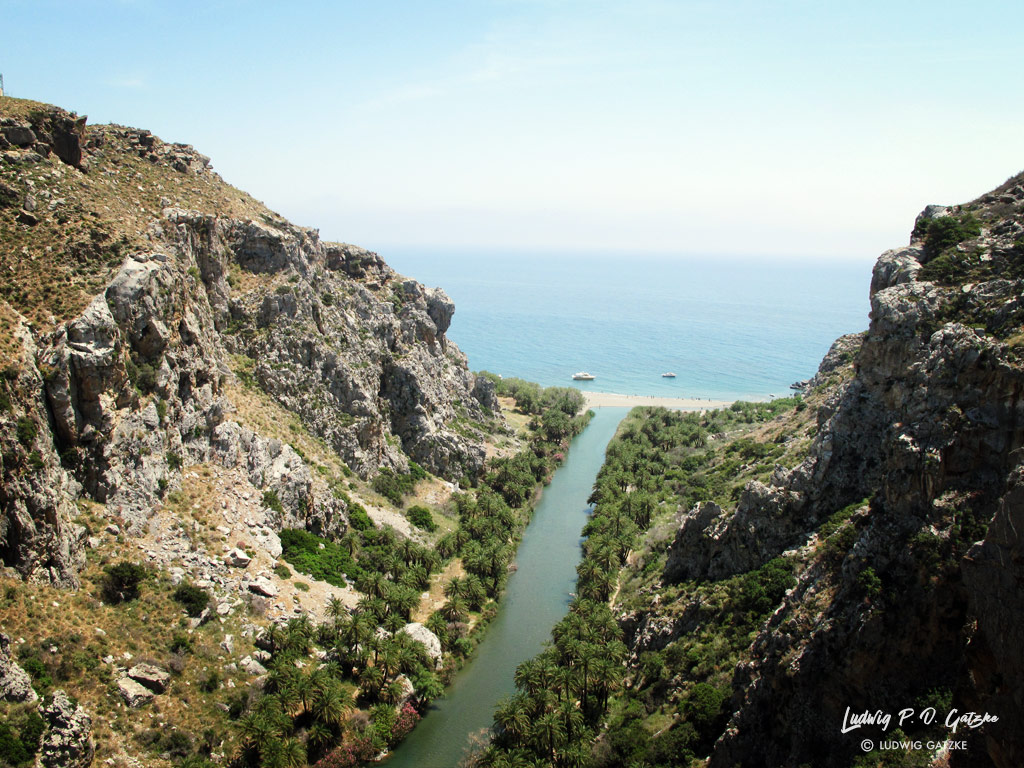 The palm beach of Preveli (Φοινικόδασος της Πρέβελης) on the south coast and near Plakias is next to the palm beach of Vai (Eastern Crete) the only beach of Crete where the Cretan date palm grows. The river Megalopotamos coming from the mountains flows here by a ravine up to the sea, at its banks up to the sandy beach the palms form a close roof, which is crossed in the summer by blooming Oleander.