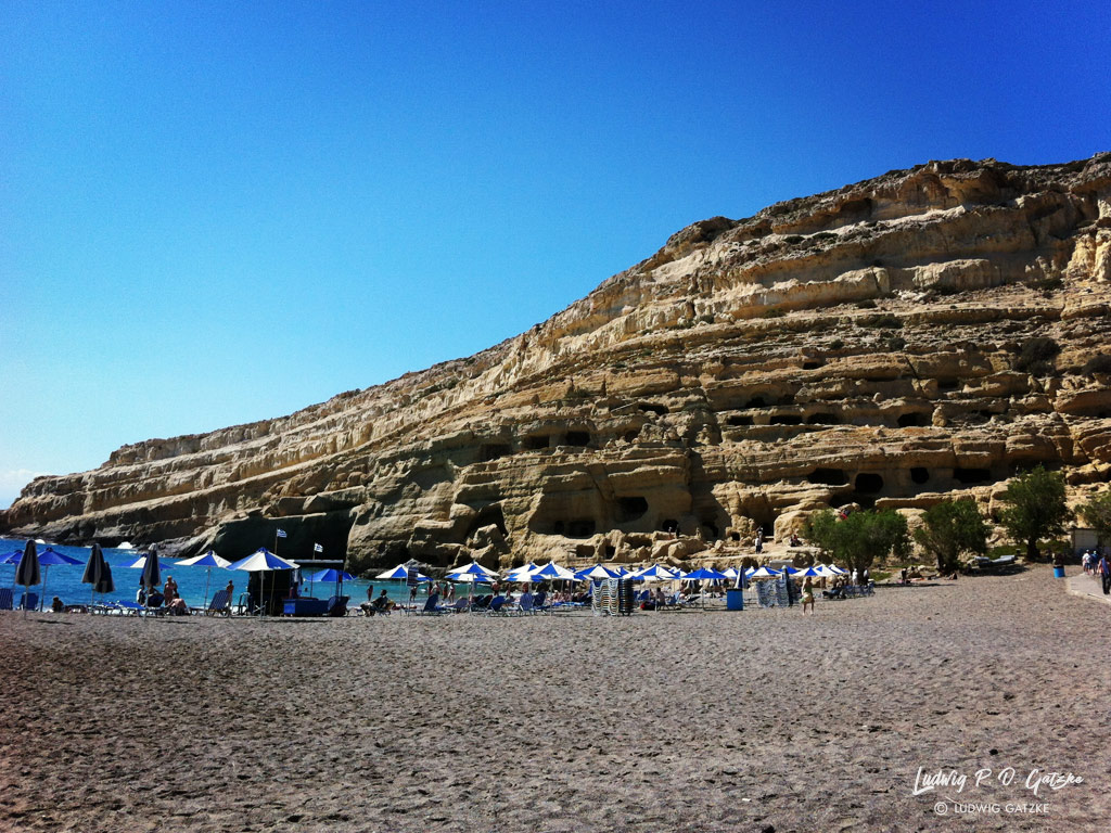 Matala (Μάταλα) is a small town on the south coast of Crete with maybe 100 inhabitants. The tourist resort was discovered in the 1960s by hippies who settled in caves that were originally carved into soft stone in the Neolithic period. Later the Roman occupiers used the caves as tombs.